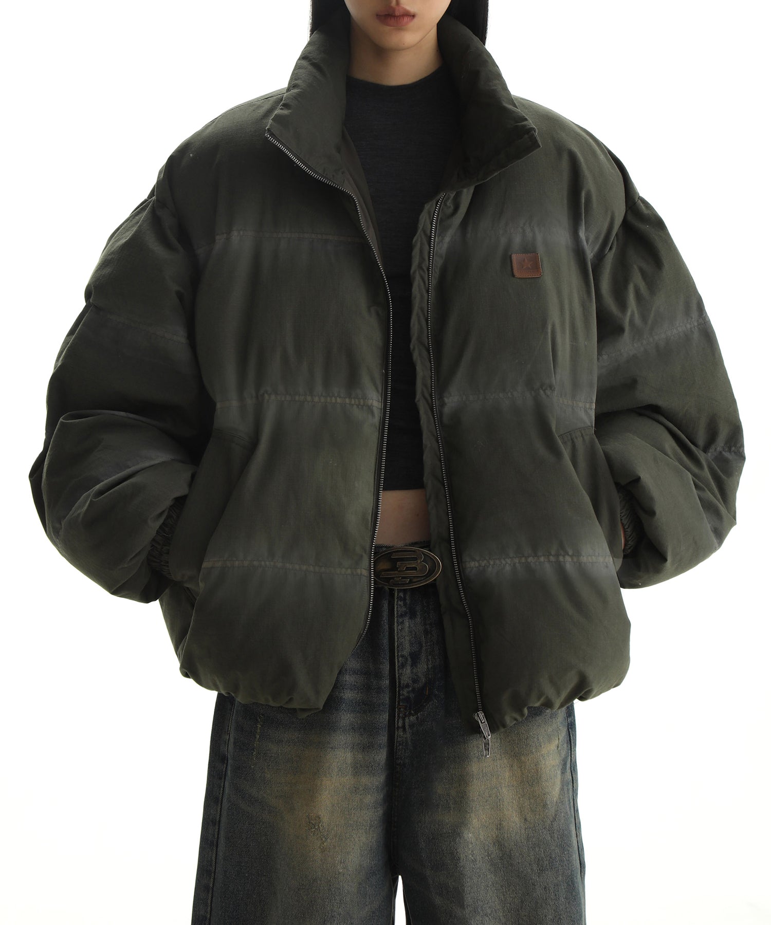 An oversized, high-neck padded voluminous jacket with a striking presence.